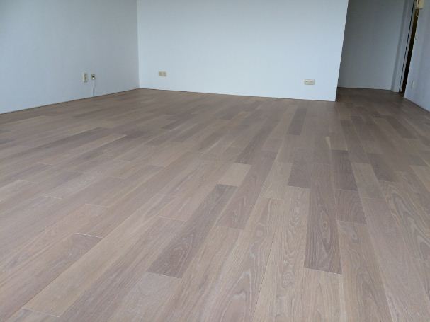 Eikenvloer na afwerking, wit pigment en projectlak (11e verdieping in Leiden)