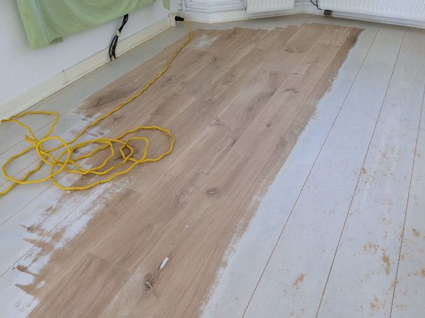 Geschilderde eikenhouten vloer (tijdens het schuren)
